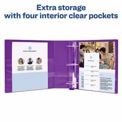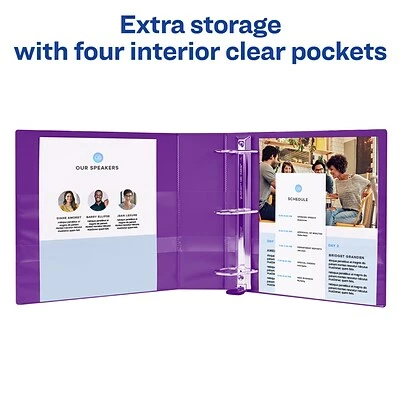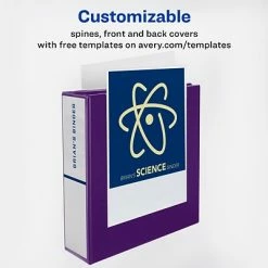 This Heavy-Duty View Binder with One Touch rings is perfect for extended use. From everyday referencing to classroom notes and home business use-this binder’s strong enough to handle them all. The DuraHinge(R) design is stronger, lasts longer and resists tearing, while the DuraEdge(R) feature makes the sides and top more pliable to resist splitting. Our deep texture film offers a smoother finish and features a linen pattern for high quality look and feel. Just pull the lever to open the rings for adding, replacing and removing pages. Then push to lock the rings in place. Customize the purple cover with free, easy-to-use templates and designs at avery.com/print.