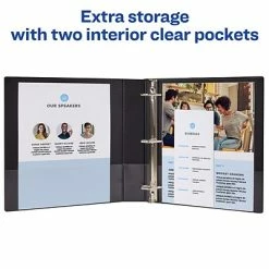 The Avery slant D-ring binder features two ring boosters for easier opening and closing. Two inside pockets expand storage by 20 pages, keeping important materials together. The wider front and back panels protect any internal dividers or sheet protectors during storage. Each Avery 1.5-inch slant D-ring binder has a front cover overlay which lets users slide customized title pages in easily.