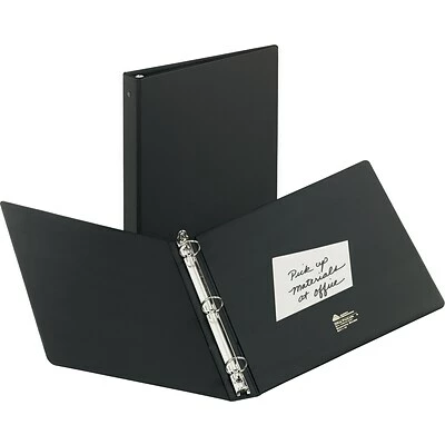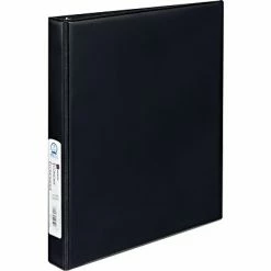 Sturdy binder for light use. Two interior pockets. Exposed rivets on back cover. Round ring has non-locking mechanism. Holds 8-1/2″ x 11″ documents. Merchandising spine label included. 35% minimum post-consumer content.