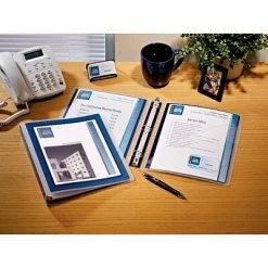The 1.5-inch Avery Flexi-View presentation binder incorporates features that make it ideal for handouts at client meetings or trade shows. An embossed design on the front cover frames custom title pages inserted into the clear overlay, and the interior front cover has another overlay that holds index pages or other marketing materials. With a business card slot on the interior, recipients will always know who to contact.
