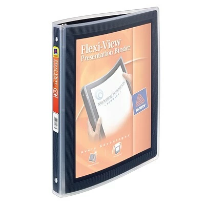 Store presentations, handouts, reports or important marketing materials inside the Avery Flexi-View .5-inch round ring binder. The front cover sports a preprinted border and clear overlay that holds custom title