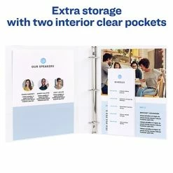 This Heavy-Duty View Binder with slant rings is perfect for extended use. From everyday referencing to classroom notes and home business use-this binder’s strong enough to handle them all. The DuraHinge(R) design is stronger, lasts longer and resists tearing, while the DuraEdge(R) feature makes the sides and top more pliable to resist splitting. Our deep texture film offers a smoother finish and features a linen pattern for high quality look and feel. Just pull the lever to open the rings for adding, replacing and removing pages. Then push to lock the rings in place. Even when filled to its 120-page capacity, this binder still has four stacked pockets for a bit of extra space inside. Customize the cover with free, easy-to-use templates and designs at avery.com/print.