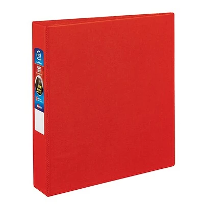 With this Heavy-Duty Binder you get one-touch operation and everyday durability. The DuraHinge(R) design is stronger, lasts longer and resists tearing, while the DuraEdge(R) feature makes the sides and top more pliable to resist splitting. A deep texture film offers a smoother finish and features a linen pattern for high-quality look and feel. The exclusive EZD(R) rings open and lock closed with one touch, and hold more sheets than the same size slant and round rings. Also, the rings’ gap-free design keeps your papers secure so they won’t fall out. Even when filled to its 1-1/2″ capacity, this binder has four stacked pockets for extra space inside the covers. The red binder is made with a nonstick poly construction for maximum performance, and features wider front and back panels that cover standard size dividers and sheet protectors.