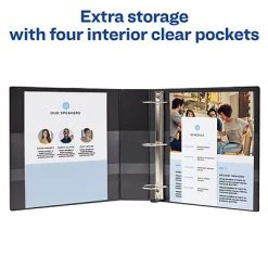 This Heavy-Duty View Binder with One Touch rings is perfect for extended use. From everyday referencing to classroom notes and home business use-this binder’s strong enough to handle them all. The DuraHinge(R) design is stronger, lasts longer and resists tearing, while the DuraEdge(R) feature makes the sides and top more pliable to resist splitting. Our deep texture film offers a smoother finish and features a linen pattern for high quality look and feel. Just pull the lever to open the rings for adding, replacing and removing pages. Then push to lock the rings in place. Even when filled to its 670-page capacity, this binder still has four stacked pockets for a bit of extra space inside. Customize the black cover with free, easy-to-use templates and designs at avery.com/print.