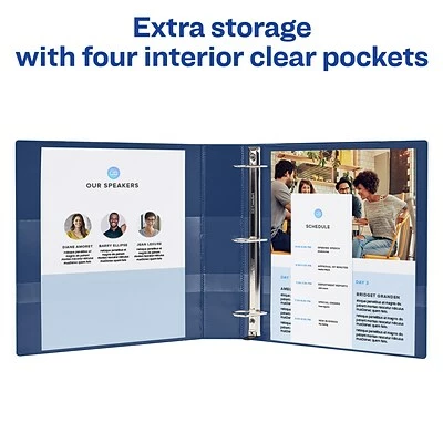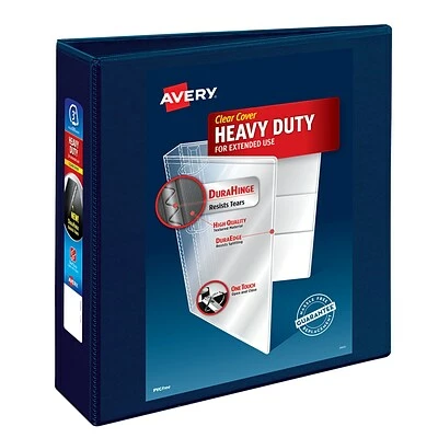 This Heavy-Duty View Binder with One Touch rings is perfect for extended use. From everyday referencing to classroom notes and home business use-this binder’s strong enough to handle them all. The DuraHinge(R) design is stronger, lasts longer and resists tearing, while the DuraEdge(R) feature makes the sides and top more pliable to resist splitting. Our deep texture film offers a smoother finish and features a linen pattern for high quality look and feel. Just pull the lever to open the rings for adding, replacing and removing pages. Then push to lock the rings in place. Even when filled to its 400-page capacity, this binder still has four stacked pockets for a bit of extra space inside. Customize the navy blue cover with free, easy-to-use templates and designs at avery.com/print.