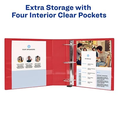 This Heavy-Duty View Binder with One Touch rings is perfect for extended use. From everyday referencing to classroom notes and home business use-this binder’s strong enough to handle them all. The DuraHinge(R) design is stronger, lasts longer and resists tearing, while the DuraEdge(R) feature makes the sides and top more pliable to resist splitting. Our deep texture film offers a smoother finish and features a linen pattern for high quality look and feel. Just pull the lever to open the rings for adding, replacing and removing pages. Then push to lock the rings in place. Even when filled to its 400-page capacity, this binder still has four stacked pockets for a bit of extra space inside. Customize the red cover with free, easy-to-use templates and designs at avery.com/print.