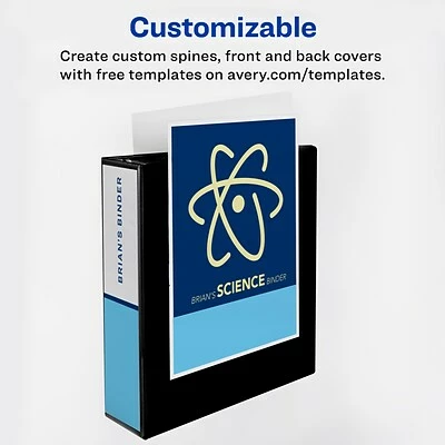 Clear cover and spine for easy customization. Four clear interior pockets offer extra storage. Wider front and back binder panels fully cover standard dividers and sheet protectors. One touch EZD locking rings open with ease and keep pages secure. EZD rings have a higher page capacity compared to same size slant and round rings. Pages lie flat with back-mounted rings. Holds 8-1/2″ x 11″ documents. Merchandising not included. 38% minimum post-consumer content.