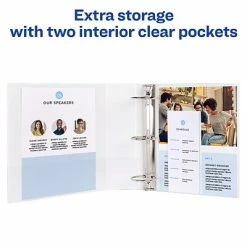 With 2-inch round rings that hold up to 375 sheets of 8.5 x 11 inch paper, the Avery light-use round ring binder is the ideal choice for day-to-day use. Store client presentations or organize reports within its durable vinyl covers, which are oversize to protect assorted binder accessories such as tabbed dividers. Tuck brochures, meeting agendas or other must-have essentials in the two interior pockets to keep them easily accessible when they’re needed.