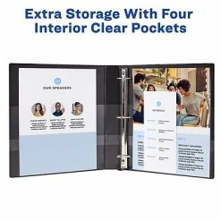 Store extra sheets with four clear interior binder pockets made with smudge-resistant plastic