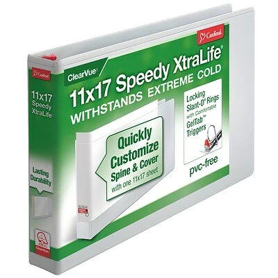 The Cardinal 1-inch heavy-duty binder is composed of eco-conscious materials that are less harmful to the Earth. The entire cover, including the spine, contains XtraLife polyolefin that is environmentally safer than vinyl. The Cardinal nonstick vinyl bi nder holds up to 270 sheets of 11 x 17 inch paper that loads easily onto slanted 1-inch D-rings. Customize this organizer by inserting a letter-size sheet under the spine and front cover. The Cardinal Speedy XtraLife 1-inch slant D-ring binder includes easy-grip GelTab triggers that make it easy to open and close the rings.
