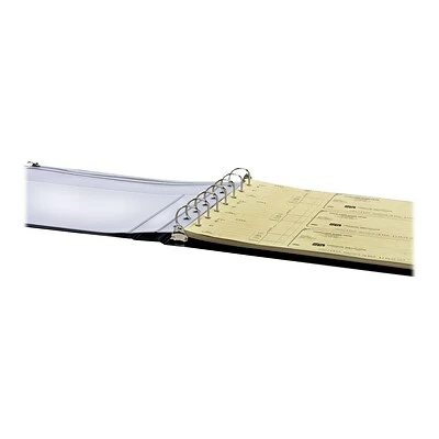 Professional Appeal for a small business with a professional checkbook by choosing this Cardinal 1-inch Slant-D ring binder, which features a black and gray textured cover and solid black interior lining for a clean, professional look. It’s sized to hold check-on-a-page formatted sheets that come three checks per page, and the seven 1-inch Slant-D rings hold up to 225 sheets for adequate storage. Secure and convenient storage, removable pouch, complete with a zippered portion and an open flat pocket, gives quick access to pens, stamps and other check-writing supplies. The Cardinal black 1-inch check binder has seven sturdy metal Slant-D rings that keep checks and stubs securely inside while making it easy to flip through pages.