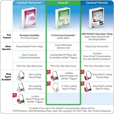 This Cardinal XtraLife ClearVue 1″ Slant-D locking binder hold up to 270 documents and offer inside pockets for extra storage. Use the clear overlays to label the contents, and enjoy the easy-to-use Slant-D rings and GelTab trigger system. Built to resist split seams and torn hinges, this binder it designed for regular use, and the nonstick material makes this binder safe for archiving documents. Made of more than 55 percent post-consumer materials, this binder also reduces your impact on the environment by limiting waste.