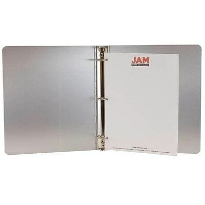 Organize and store important documents in the JAM Paper aluminum silver 1-inch round ring binder, which is constructed of a silver aluminum cover for extra durability and protection. With its reinforced spine, this product can be used long-term for any professional need, even when used in harsh conditions. The reinforced spine of this aluminum binder offers added strength and ensures longevity.