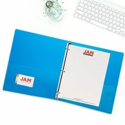 JAM Paper® Blue Plastic 3 Ring Binder features a class twill finish and enough space to store approximately 175 sheets of paper. Designed to fit easily in a backpack or on your office shelves, the vibrant color and convenient size of this binder can help you stay organized at school or at work. Made of light, yet durable plastic, these binders are easily portable and ideal for protecting papers from class room to board room. With about 10 x 11 inch covers, they fit all standard sized documents. They also feature an inside pocket and business card slot on the left the inside cover for extra storage and organization convenience.