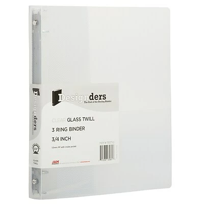 The JAM Designders .75-inch round ring binder features a translucent exterior that complements any office color scheme and allows users to tell its contents immediately. Its twill grid pattern causes it to stand out from other binders. Users can use this JAM clear binder and other colors of binders in the Designders series to categorize information by subject or account.