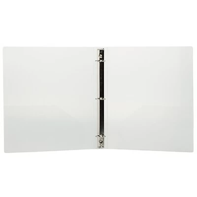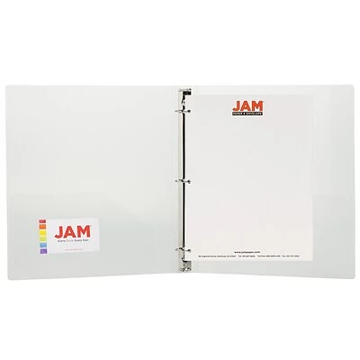 Keep important documents organized with JAM Paper white flexible poly binders. The standard 1-inch ring size and 11.6 x 10.4 inch size of the binder can easily store standard-sized paper documents. Because these binders can store anywhere from 180 to 220 sheets of paper, depending on the card stock and whether clear plastic sheets are used, they can hold essential documents without taking up a lot of space. Each binder includes one inside die-cut pocket that fits business cards and CDs.