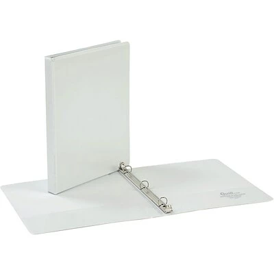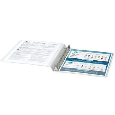 Clear overlay for customization on all three sides. PVC-free, non-stick material will not damage contents. Clear pockets on the inside front and back covers are ideal for storing loose documents. Back mounted round rings provide a cleaner look. Holds 8 – 1/2″ x 11″ sheets. 1/2″. White. 125 sheet capacity.