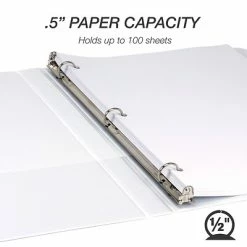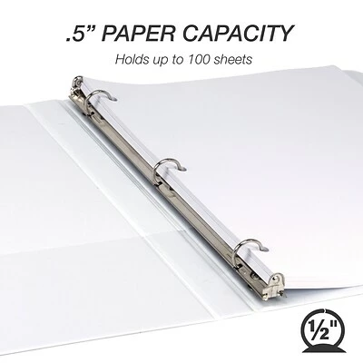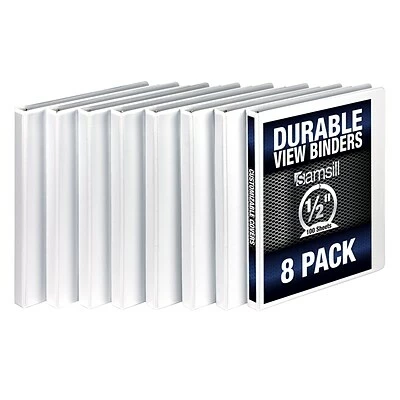 This 8 pack of durable white half-inch binders feature a clear overlay on the front, back, and spine giving full control and flexibility over customization of presentations, organizational projects, office reports, class projects, and more. Order multiple binders to create a custom reference system for weekly or monthly office reports, multiple classes at school, or other unique personal or professional projects.