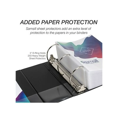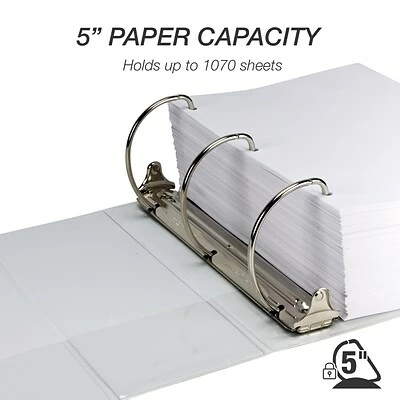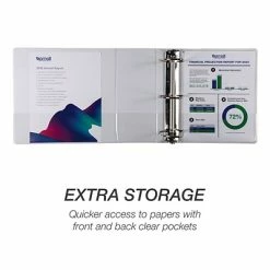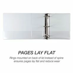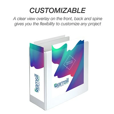 The Nonstick locking D-ring view binder is made of acid-free and archival-safe polypropylene. A clear overlay on the front, back, and spine allows for easy customization. Locking D-rings hold up to 25% more than standard round rings. Rings mounted on back lid allow pages to lie flat and reduce wear.
