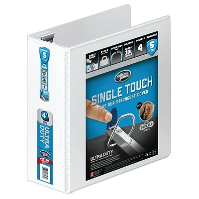 Four inch binder holds 880 sheets. Get premium features, a higher sheet capacity, extra pockets and the best durability with Ultra Duty binders. Plus, a crystal clear overlay on the spine and covers make it easy to personalize and label an Ultra Duty binder for grab-and-go use. Ultra Duty combines our best ring with our strongest covers for unmatched ease of use and strength. D-Lock™ rings with a Single-touch trigger keep papers secure yet are so easy to open that you can use just one finger. Ultra Duty covers are made from custom formulated PVC Free polypropylene which lasts up to 10X longer than vinyl and is more eco-friendly.