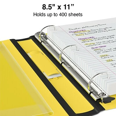 Keep documents, presentation materials and proposals safe and organized with this yellow 1 1/2-inch D-ring binder. Featuring 1 1/2-inch rings, this archive-safe binder accommodates up to 400 pages and keeps stored documents smudge-free with nonstick construction. This Staples Better yellow 1 1/2-inch binder features a reinforced, rubberized spine that offers impressive durability and stores up to an additional 100 pages with a heavy-duty storage pocket.