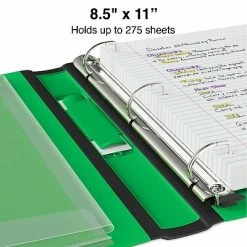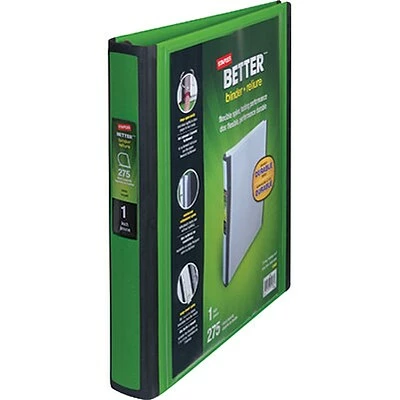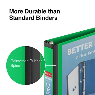 Organize documents with ease by using this green view binder. The three D rings let pages lie flat while holding up to 275 sheets of paper, and they can open with a single touch for easy insertion and removal of papers. This Staples Better view binder has a flexible spine to help resist splitting, while the interior pockets offer extra storage space.