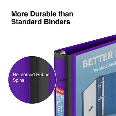 Documents can be safely stored in the Staples Better view binder with 1-inch D-rings, which features a rubberized reinforced spine and edges along the cover to protect the contents inside. The clear overlays let users design, print and insert a cover page and spine label for customized organization. The nonstick, archival-safe material ensures that ink or toner does not lift from pages so that they always look sharp.