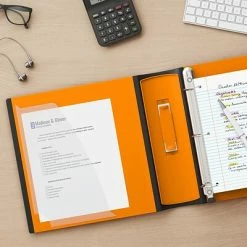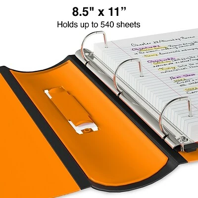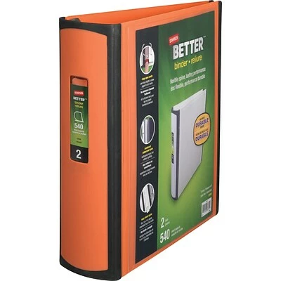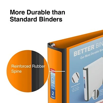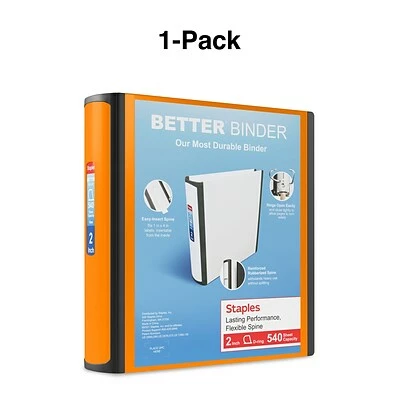 Corral papers, packets and handouts in this orange three-ring view binder. Featuring 2-inch D rings, this folder keeps pages flat and accommodates up to 540 pages. View windows on the spine and front cover let you easily slip in custom labels and two inner pockets provide extra space for loose papers. With its reinforced rubberized spine and outer edges, this Staples Better binder stays in place on slanted surfaces and is durable for heavy-duty use.