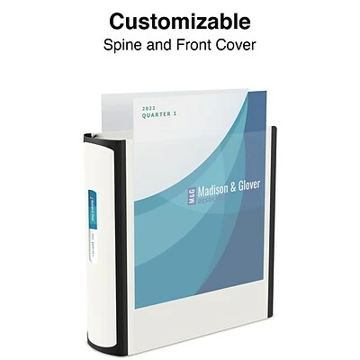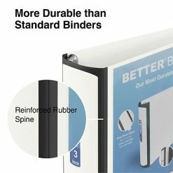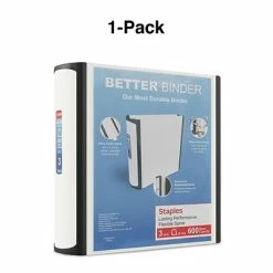 The Staples Better view binder with 3-inch rings is designed to handle daily wear and tear with a spine and edges that are reinforced with rubber to absorb shock and prevent splitting, Nonstick covers won’t lift toner or ink off of printed pages, making it an ideal choice for long-term, archival storage. An easy-insert spine label and clear front overlay offers easy customization through identifying labels and title pages.