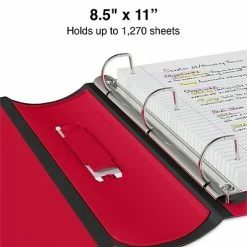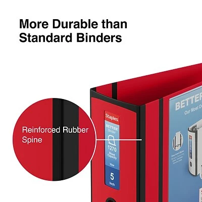 Compile large amounts of documents with this Staples Better three-ring binder. The locking D-rings close securely without gaps to prevent document loss and damage, while the 1,000-page capacity is ideal for storing reference materials, compliance forms and inventory lists. Four stacked interior pockets provide additional storage for blank forms or notes. This Staples Better three-ring binder features wider front and back panels, providing full coverage for pages and index tabs.