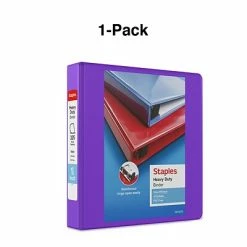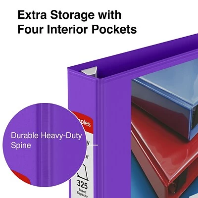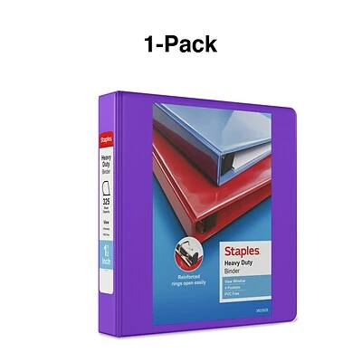 Keep essential papers protected with this Staples heavy duty purple view binder. The heavy-duty spine and edges provide durability to withstand daily wear and tear, while the 1.5-inch D rings hold up to 325 sheets of paper and allow for smooth page turning. This Staples heavy-duty purple view binder has a clear overlay that lets you insert your own labels, so you can make it look exactly the way you want.