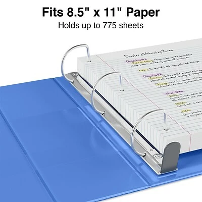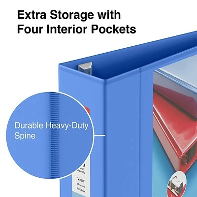 Organize paperwork with this periwinkle view binder. The D-rings close securely to prevent pages from slipping, and the clear overlay lets you add a custom title page or table of contents to the front cover. Four interior pockets offer storage for notepads, brochures and other items. This Staples D-ring heavy duty binder comes in periwinkle to stand out from other books and binders on office shelves.