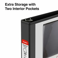 Get quick access to important papers with this black view binder. The D-rings avoid misalignment and gapping for smooth page turning each time, while the 1 1/2-inch size lets them hold up to 350 sheets of paper. This Staples standard view binder boasts two interior pockets for enhanced organization and storage options, while the wider front and back panels fully cover letter-size contents.