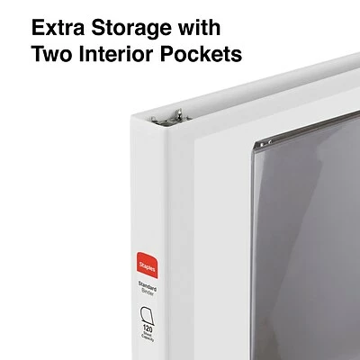 Organize documents neatly in this white view binder. The clear overlay provides space for a title page or table of contents, while the two interior pockets let you store notes, pens and other small items. Wider front and back panels provide full coverage for paper and index tabs, keeping them shielded from dirt and damage. This Staples standard view binder boasts back-mounted D-rings to help pages lie flat for easy reading.