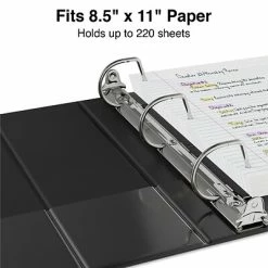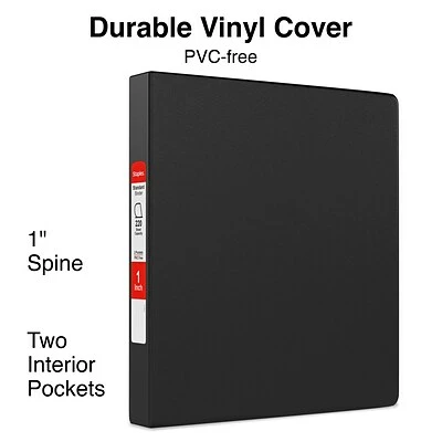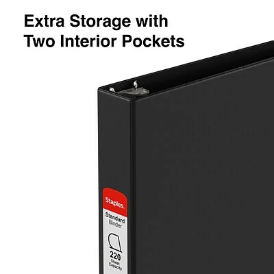 Keep papers secure by using this Staples Standard black binder. The D-ring design holds more papers than its round counterpart and lets pages lie flat, while the PVC-free plastic covers provide durability and fully cover standard dividers and sheet protectors. This Staples Standard black binder holds 100 sheets and is nonstick, so it won’t smear or lift toner off printed pages, helping papers look pristine and professional.