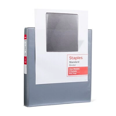 Get easy access to documents by storing them in this grey view binder. The 1″ D-ring design allows pages to lie flat, making them easier to write on. This Staples standard view binder can hold up to 220 sheets of paper and has two interior pockets for storing loose pages.