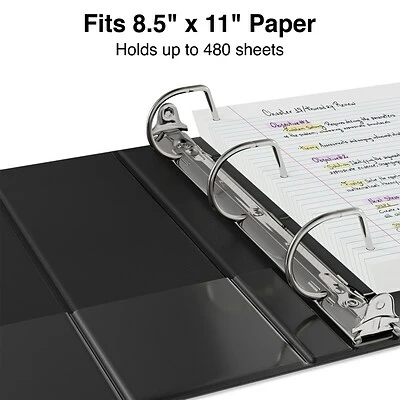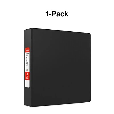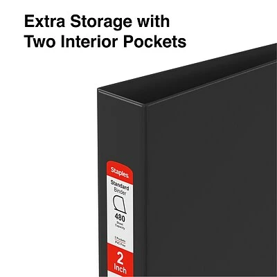 Keep pages secure with this Staples Standard black binder. The back-mounted 2-inch D-rings ensure pages lie flat, making them easier to read and write on, and the PVC-free plastic construction is produced with fewer harmful chemicals, making this binder a smart choice for helping the environment. This Staples standard black binder can hold up to 500 sheets of paper, making it ideal for training manuals or other large documents.