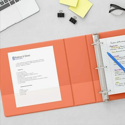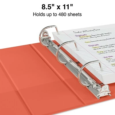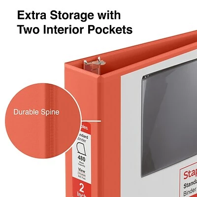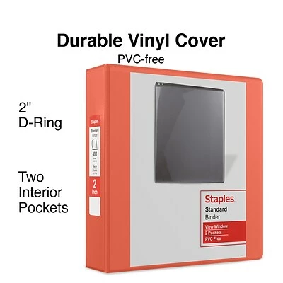 Use this Staples standard orange view binder for quickly inserting and removing important papers. The 2-inch D-rings hold more sheets of paper than their rounded counterparts and let pages lie flat, while the nonstick, archival-safe covers ensure printed pages don’t smear. This Staples standard orange view binder is made with PVC-free plastics that use fewer harmful chemicals, so it’s good for the environment.