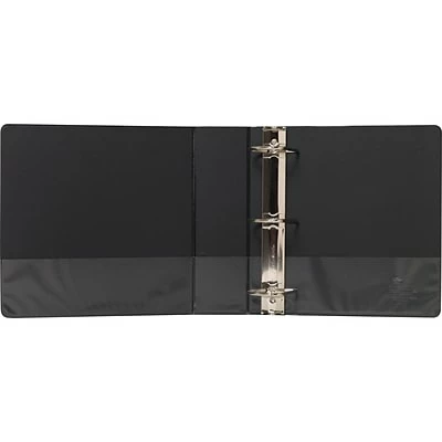 Turn pages smoothly with this Staples standard black view binder. Pages lie flat with these 5-inch rings that are capable of holding up to 950 sheets, and the covers are wide to fully cover papers and dividers. This Staples standard black view binder is manufactured with an archival-safe nonstick material that doesn’t smudge the ink on your documents.
