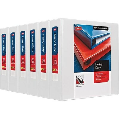 Streamline office storage with these white view binders. The folder has four stacked pockets that are perfect for storing extra papers and documents that can’t be hole punched, while the back-mounted rings make it easy to lay pages flat. The 2-inch slant D rings increase the capacity of this Staples white view binder to 500 sheets, making it perfect for storing large presentations or archiving completed projects.