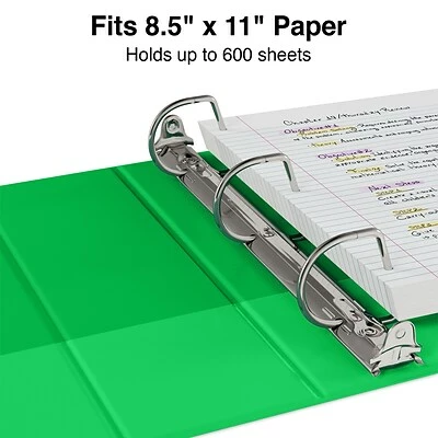 File away reports, forms and notes in this Staples standard binder. The D-rings close without gaps to prevent pages from falling out, while the 650-sheet capacity accommodates bulk stacks of documents. Nonstick PVC-free construction keeps ink and toner from transferring, so your paperwork remains neat and easy to read. Featuring wider front and back panels, this Staples standard binder protects your pages from accidental rips, tears and spills.